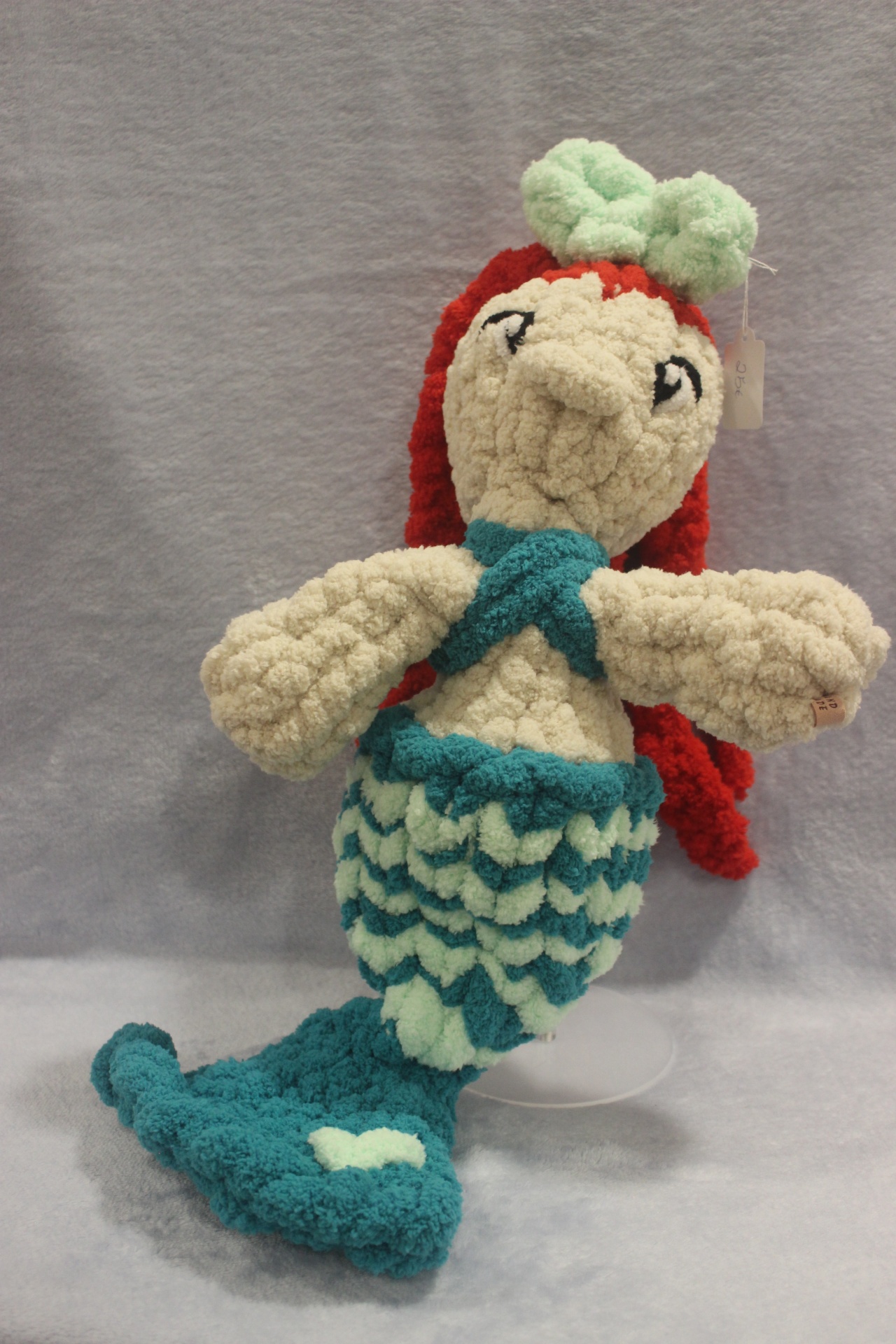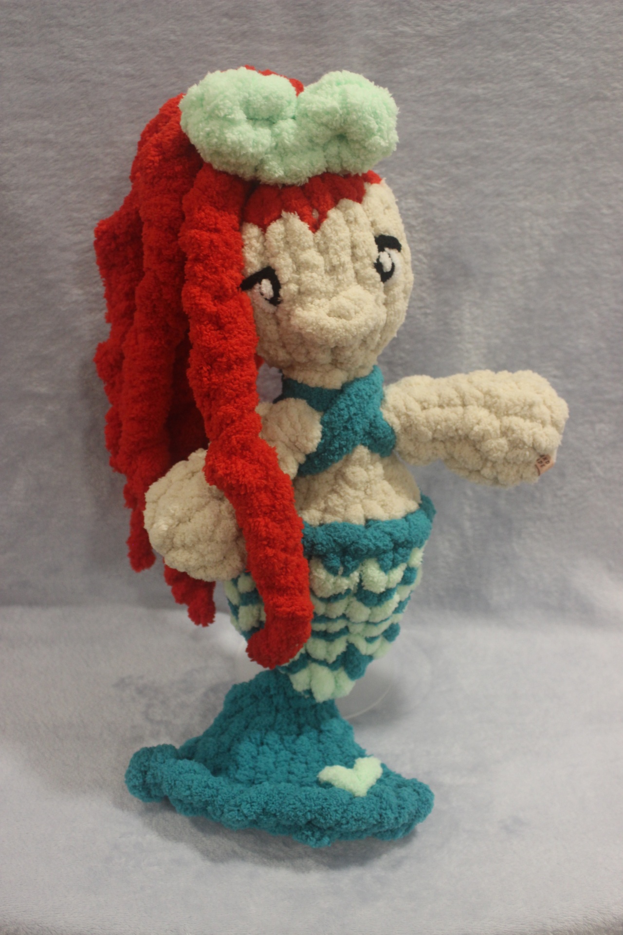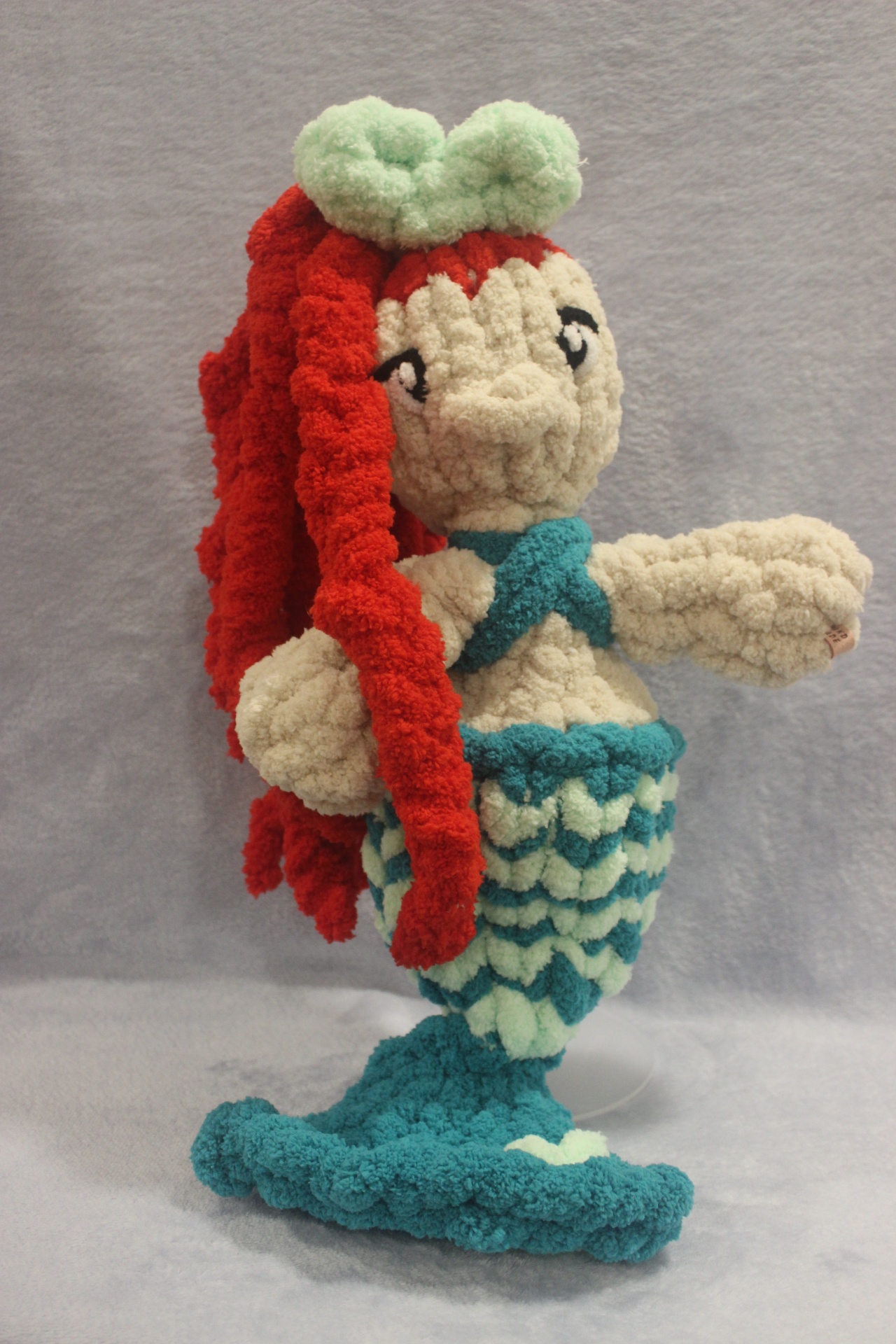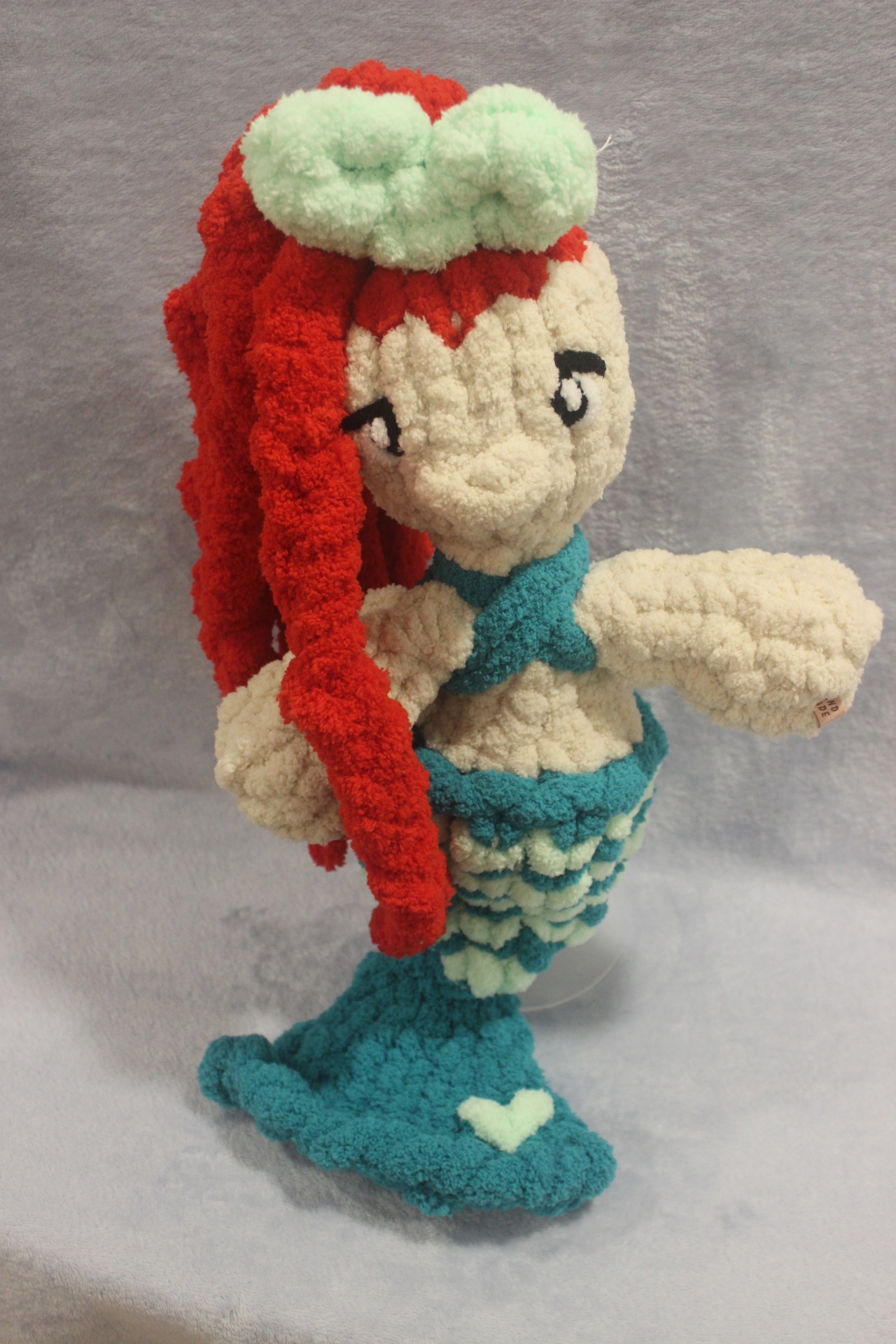 Boneco de croché de sereia com cabelo vermelho e cauda azul turquesa