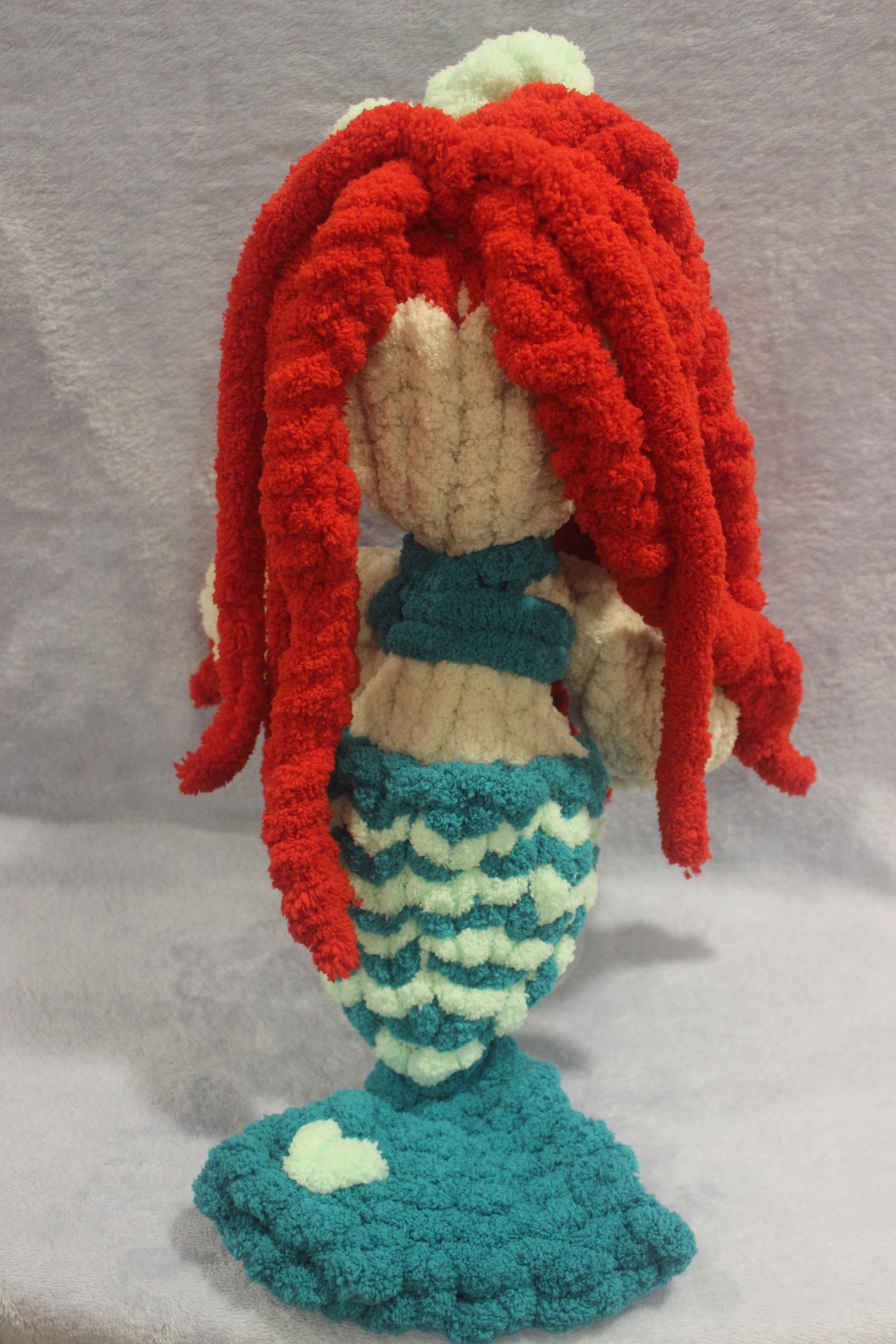 Boneca de malha de sereia com cabelo vermelho e cauda azul