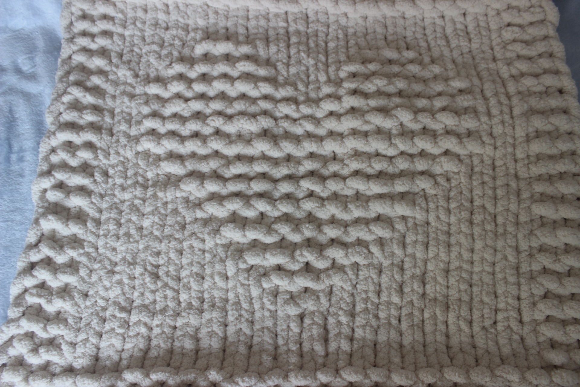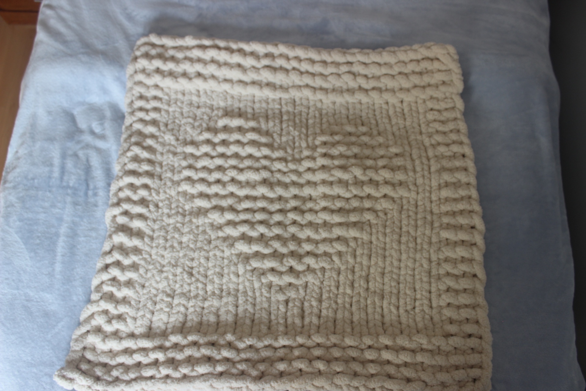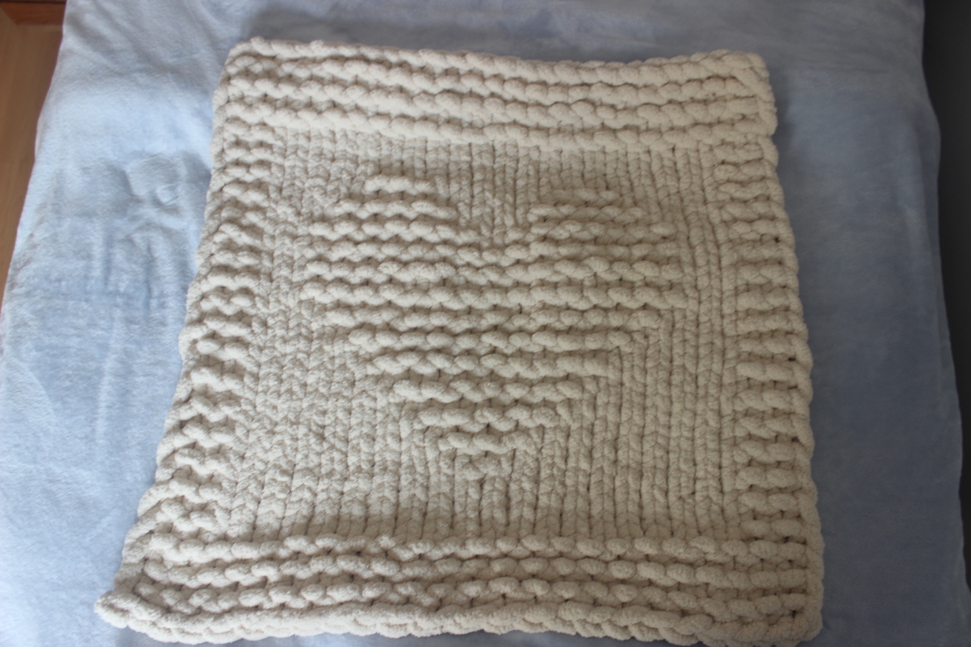 Cobertor ou manta quadrada tricotada à mão creme sobre tecido azul claro