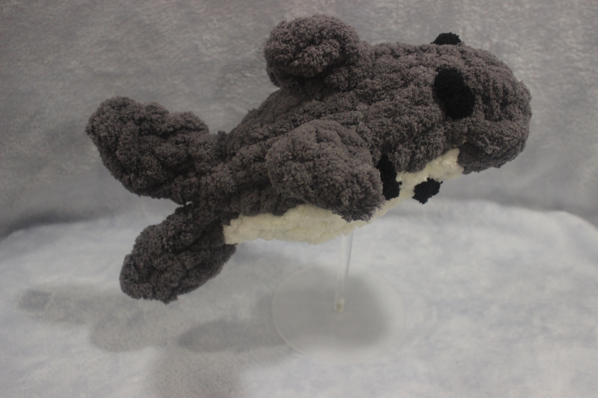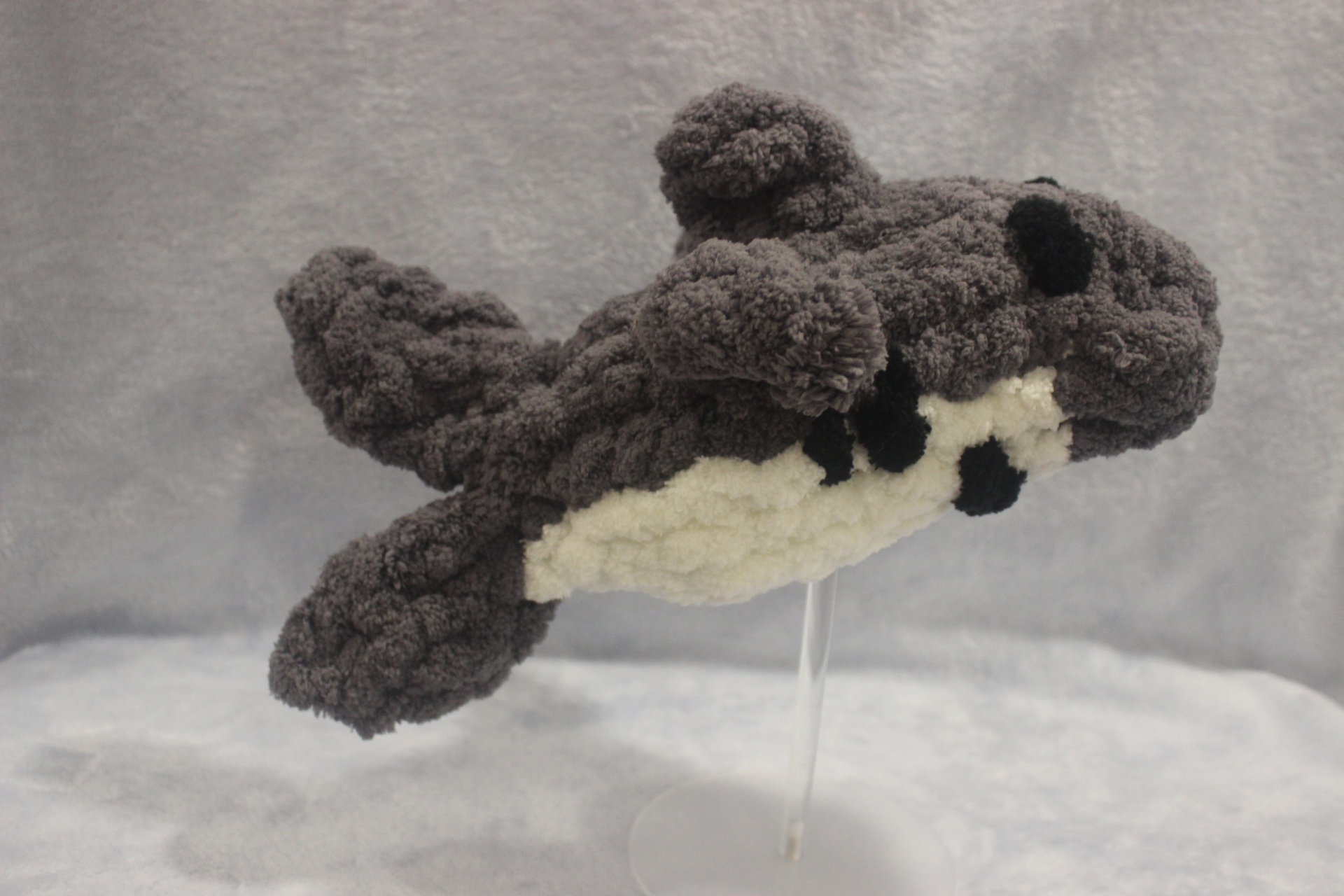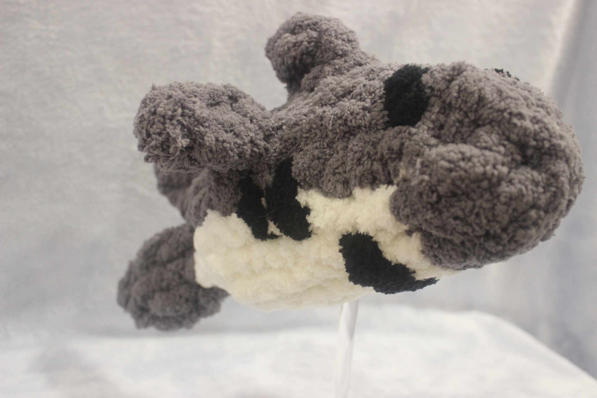 Pelúcia felpuda em forma de orca cinzenta e branca sobre suporte transparente