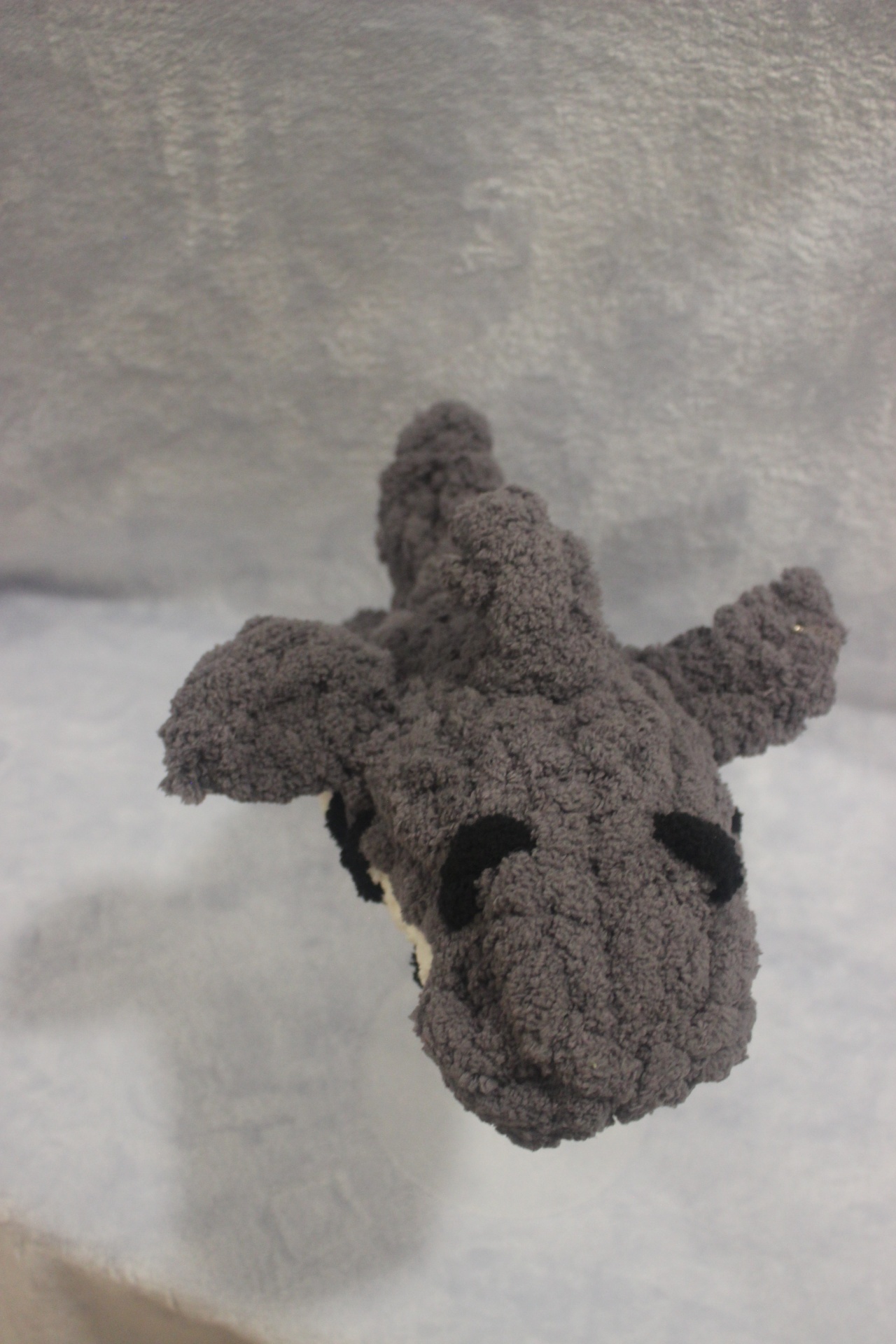 Boneco de peluche cinzento, branco e preto com textura felpuda