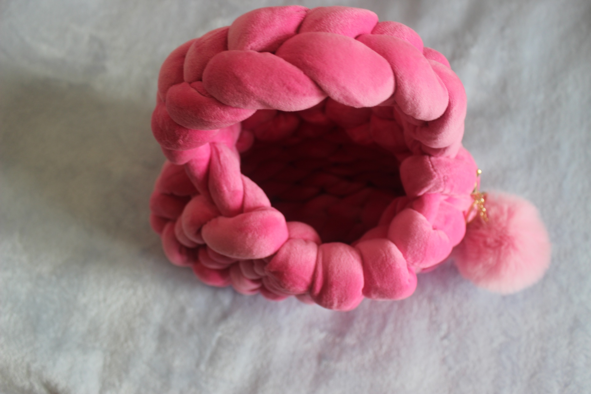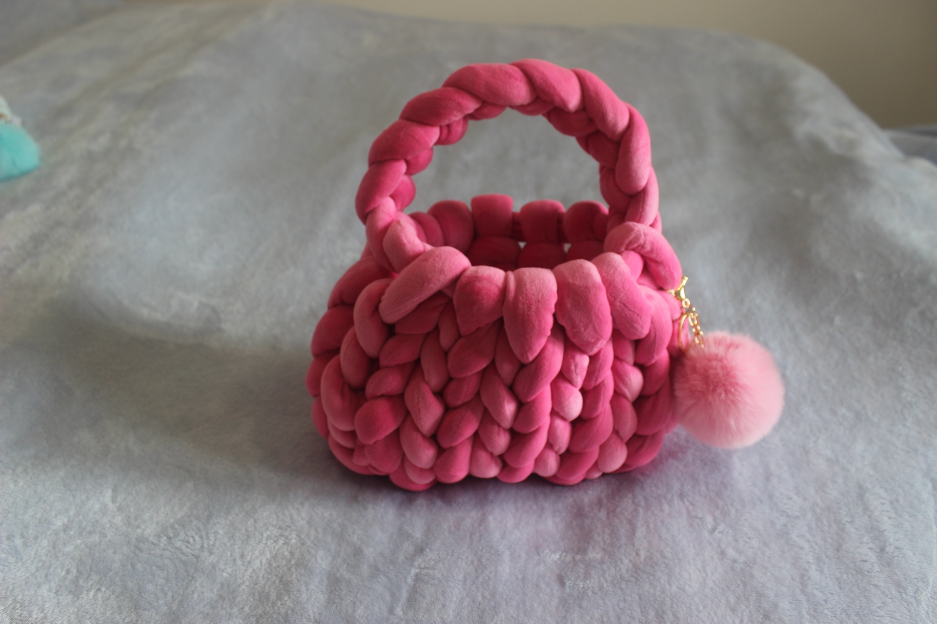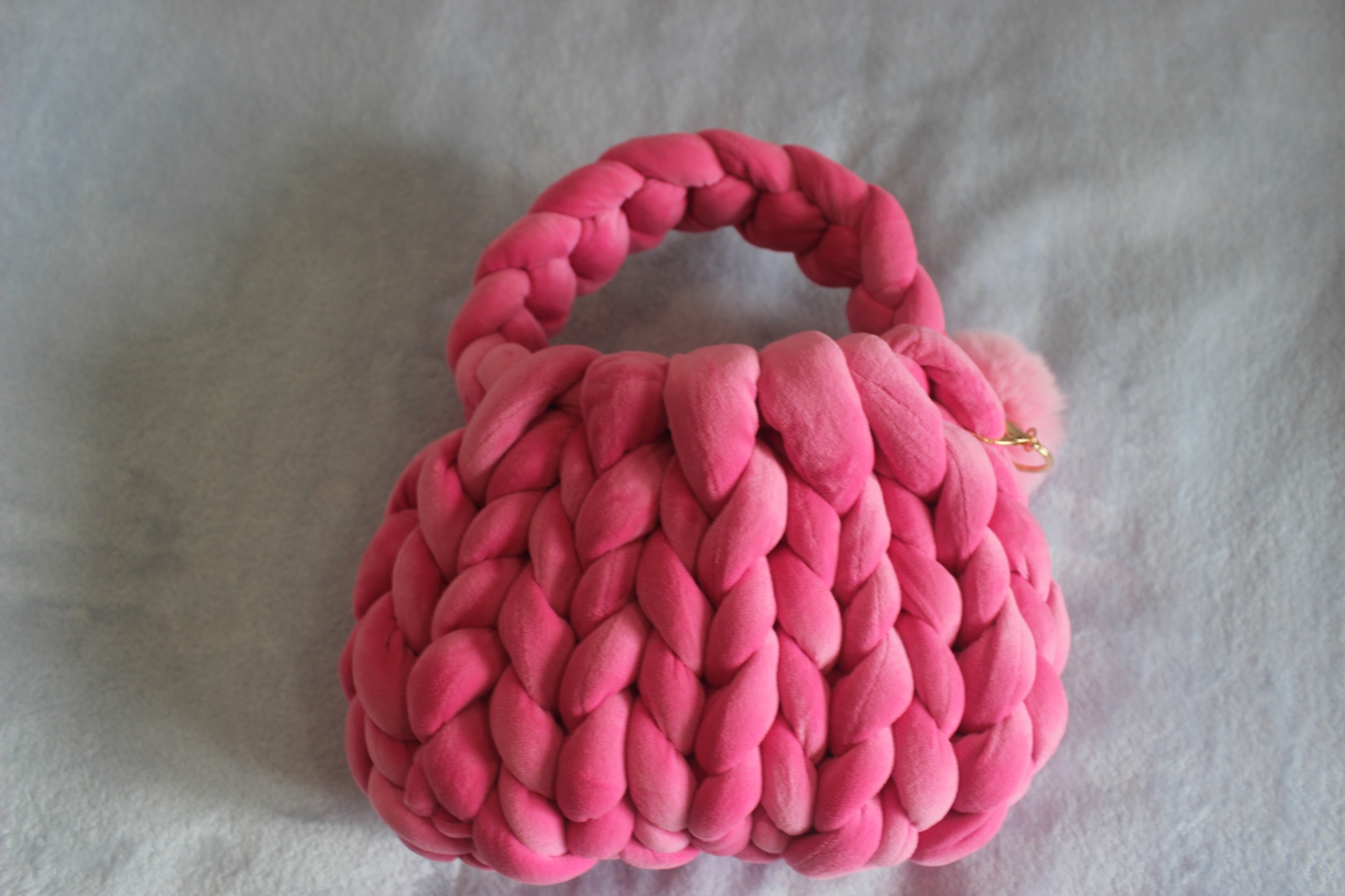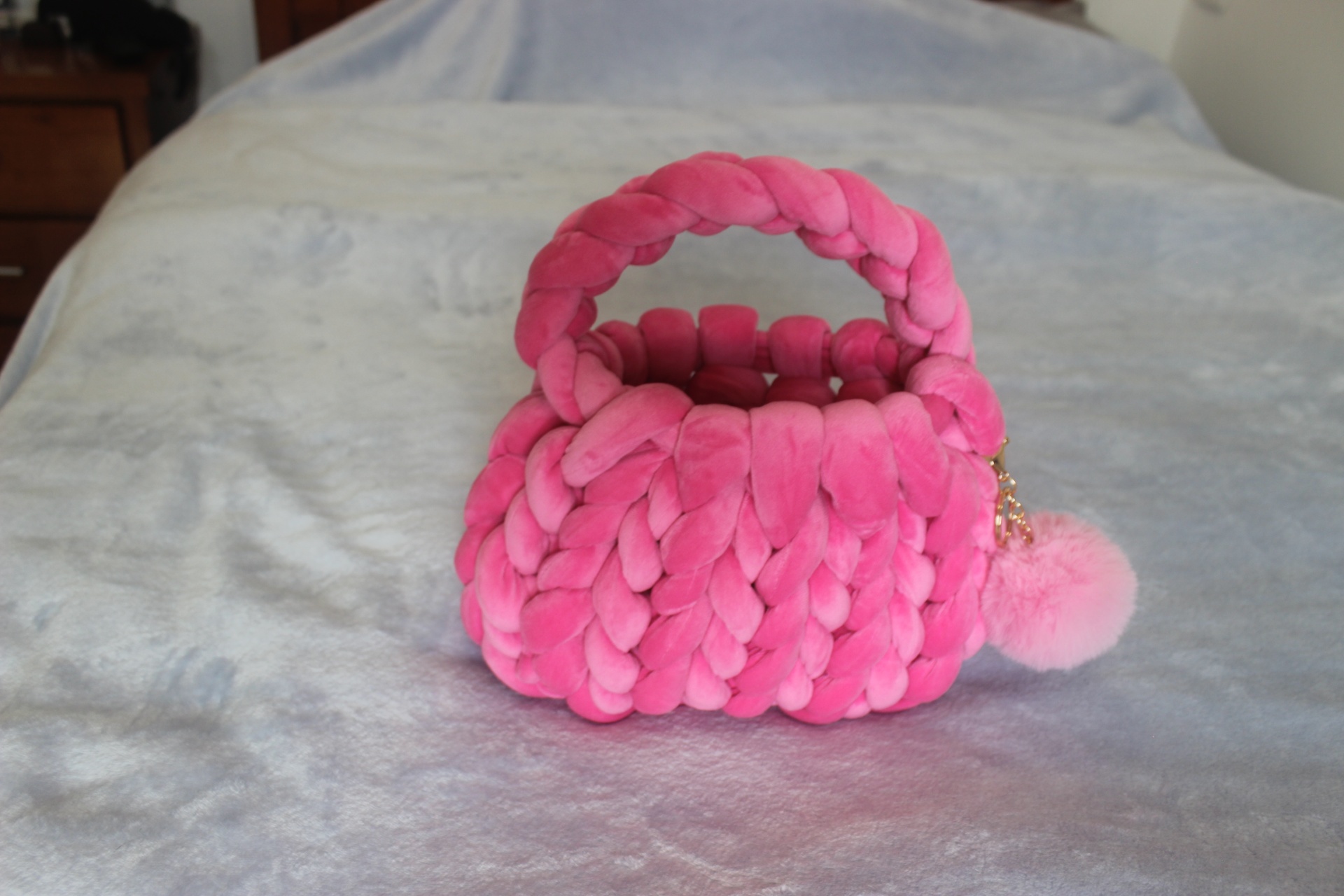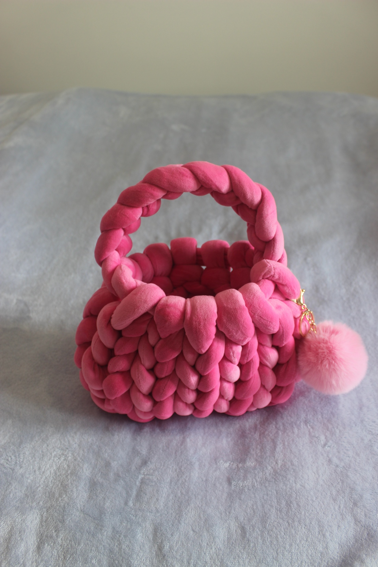 Esta charmosa bolsa feita à mão é confeccionada com fios macios rosa, criando um acessório único e atraente. É perfeita para carregar seus itens essenciais com um toque artesanal especial!