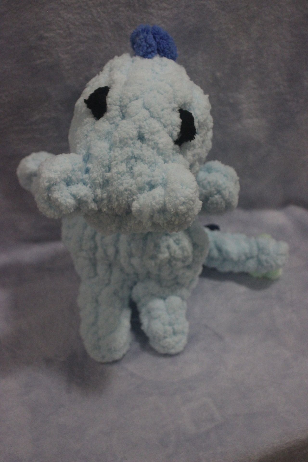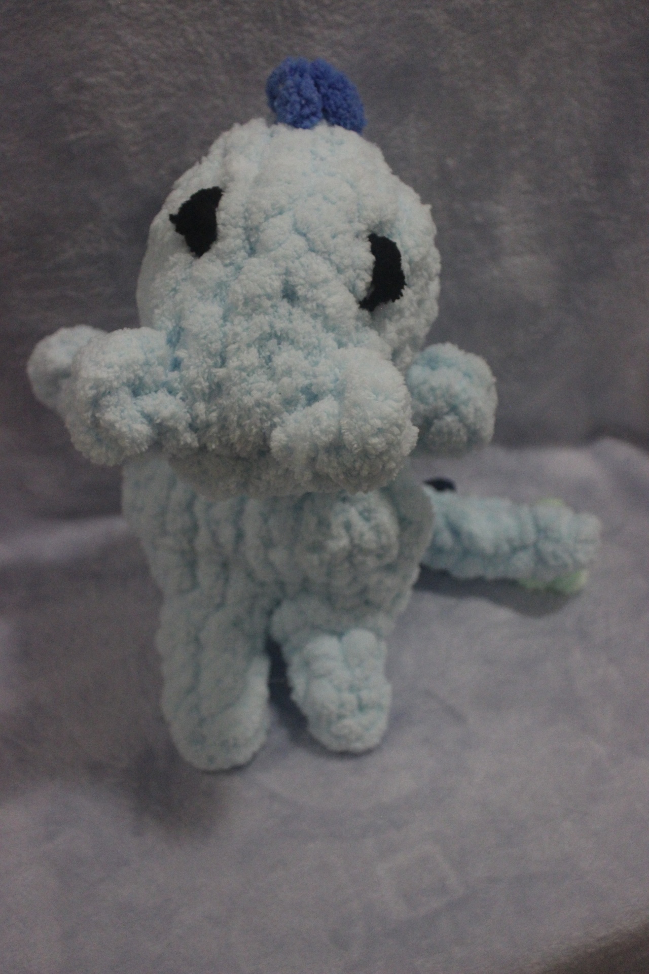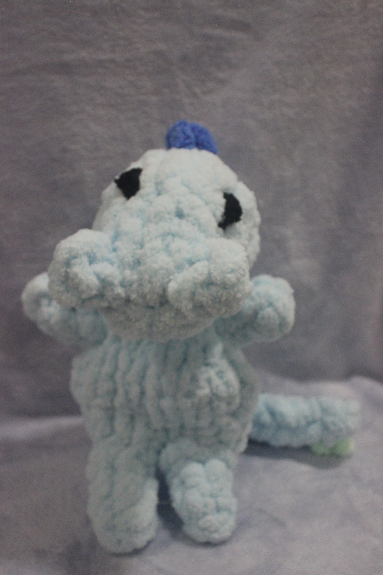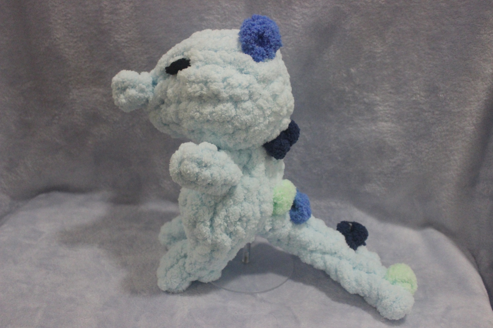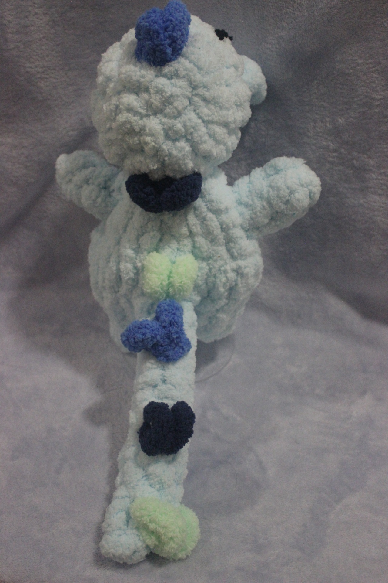 Pelúcia artesanal azul claro e escuro com pontos verdes sobre fundo cinza